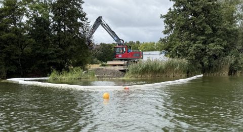 Sjuntorp miljögardin är ett slitstarkt skydd för att förhindra spridning av grumligt vatten vid muddring och schaktning.